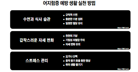 - 규칙적인 수면과 충분한 수분 섭취는 어지럼증 예방의 기본이에요. 빈속을 피하고, 혈당을 일정하게 유지하는 것도 중요하죠.