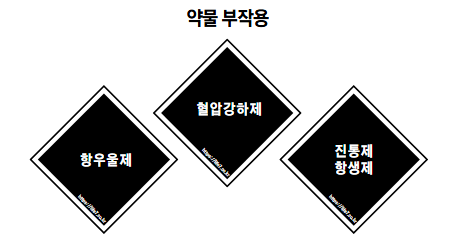 | 혈압약 | 기립성 저혈압, 현기증, 메스꺼움 |